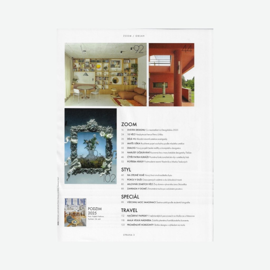 Podzimní číslo ELLE Decoration je o hledání řádu v neklidné době – návratu avantgardní estetiky, které nám určuje jasné linie tam, kde se realita začíná klikatit. Tepe mladými talenty, odkryje skryté příběhy a ukáže interiéry, které spojuje touha po světle, prostoru i osobitosti.