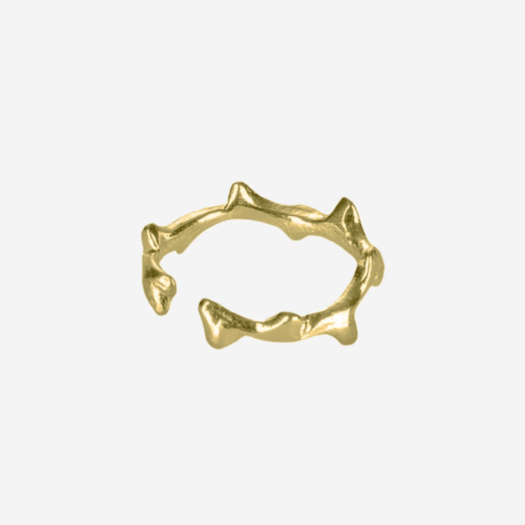 Mono náušnice ve tvaru trnové koruny od české šperkařky Nastassie Aleinikavy Kahotski je výrazný a originální šperk, který se nosí jako ear cuff, tedy kolem ucha, bez potřeby dírky. Náušnice evokuje symboliku trnové koruny a spojuje historický odkaz s moderním minimalistickým designem. Pečlivě vyrobená z kvalitního stříbra a pozlacená, dokonale kopíruje tvar ucha a poskytuje pohodlné nošení i pro celodenní outfit. Tento šperk je vhodný pro všechny, kdo hledají originální český design, který kombinuje sílu symbolu, estetiku a výraznou osobitost. Náušnice z kolekce Memento Mori.