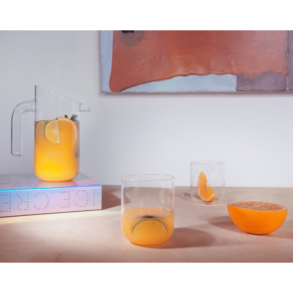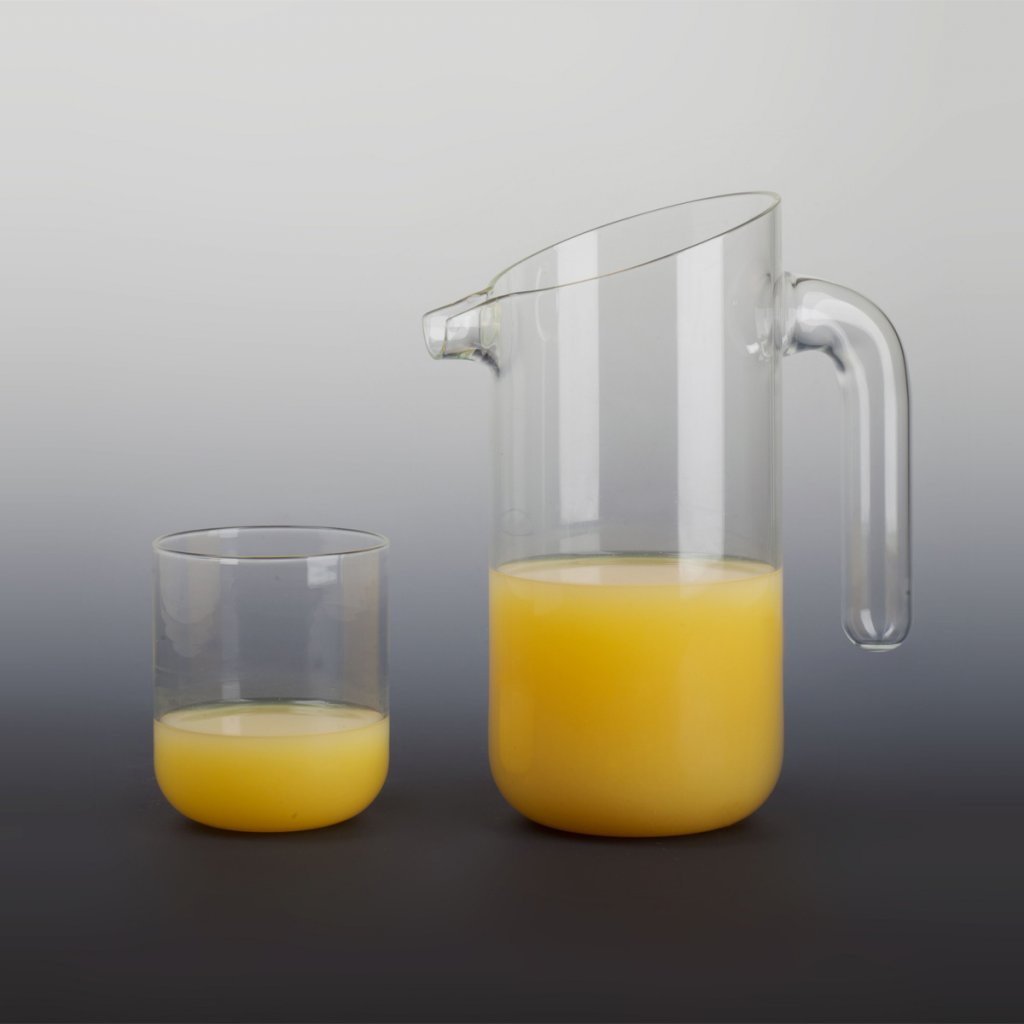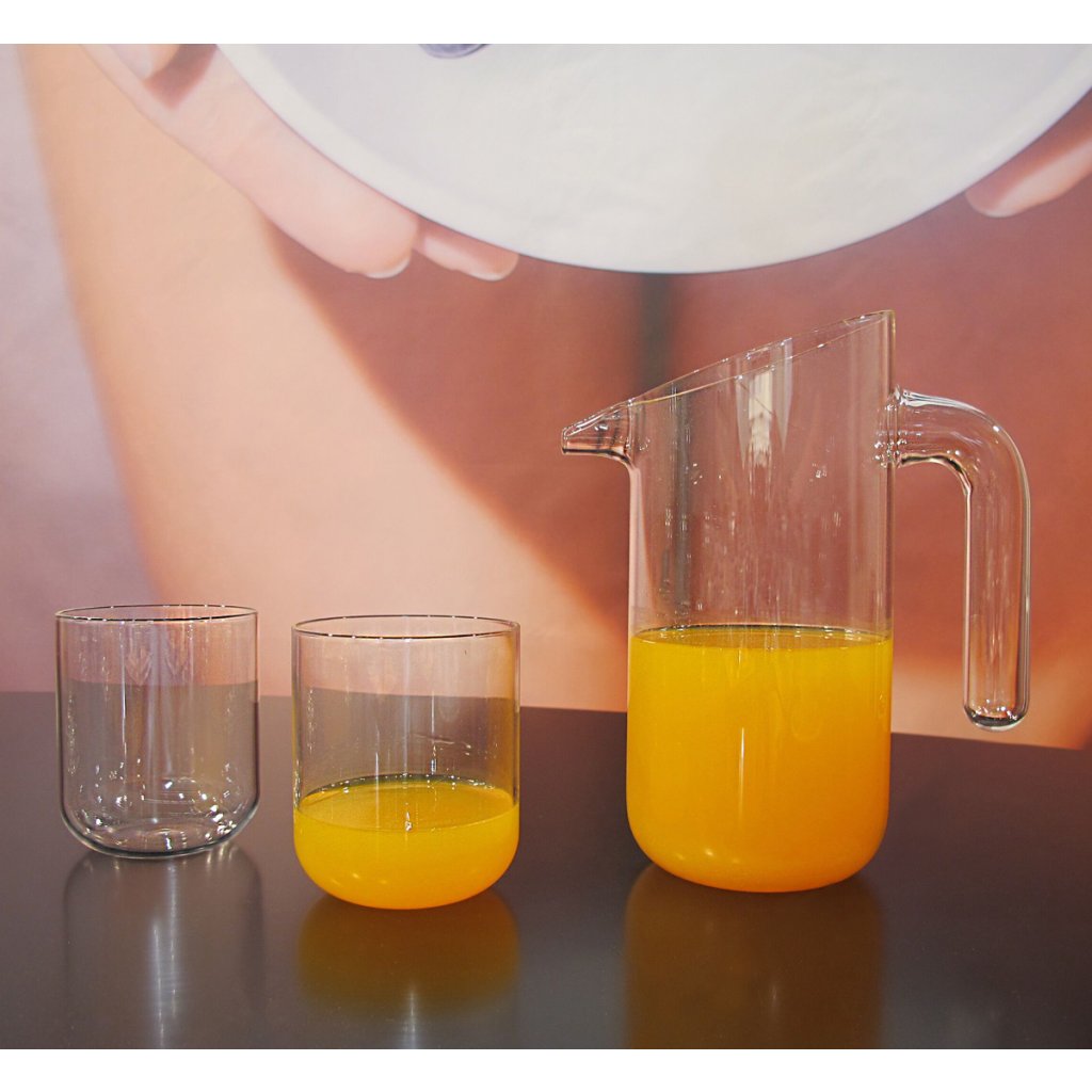 Sada POMPO je tvořená objemným džbánem a dvěma sklenkami, které se vejdou do džbánů. Tuto vychytávku oceníte zejména pokud šetříte místo v kredenci nebo pojedete na piknik. Celý set je ručně vyrobený z borosilikátového (nebo-li varného) skla a tvarově vychází z konstrukčních prvků skleněných trubic a válců.