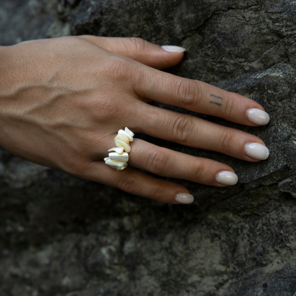 Vdechněte nový život pokladu z minulosti. Tento elegantní ale výrazný prstýnek vznikl z úlomků přírodní perleti ze starého vintage náhrdelníku. Každý kousek má svůj osobitý tvar, lesk, ale hlavně příběh – žádné dva nejsou stejné. Nevídaný a jedinečný šperk, který propojuje hravost organického tvaru s jemnou elegancí přírody. Díky nepravidelné kresbě a odleskům perleti zaujme na první pohled a dodá vašemu stylu originální detail. Šperk pro všechny, kdo hledají něco víc než jen obyčejný prsten.