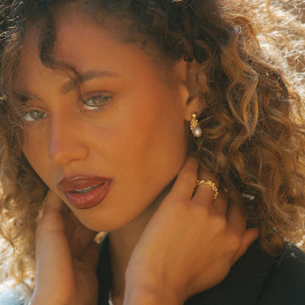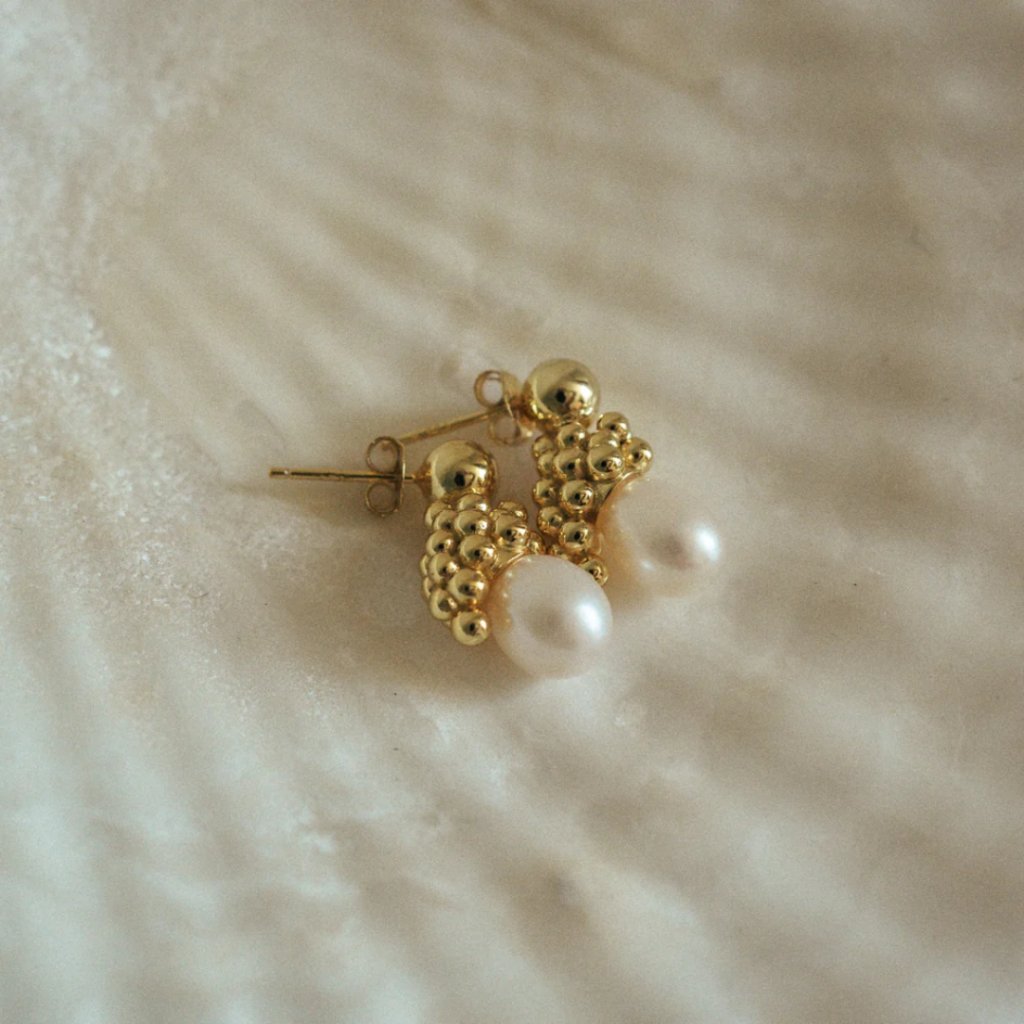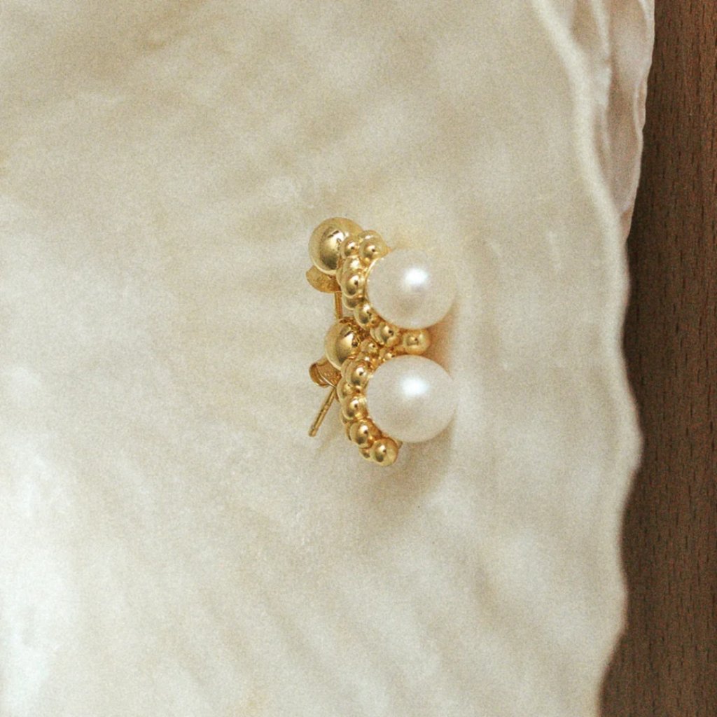 Náušnice Pearl Cascade od české designérky Martiny Rozenberg Smira oslavují lehkost a přirozenou krásu pohybu. Jemné říční perly stoupají po zlaté linii jako bublinky vznášející se k hladině, beztížné, čisté a elegantní.