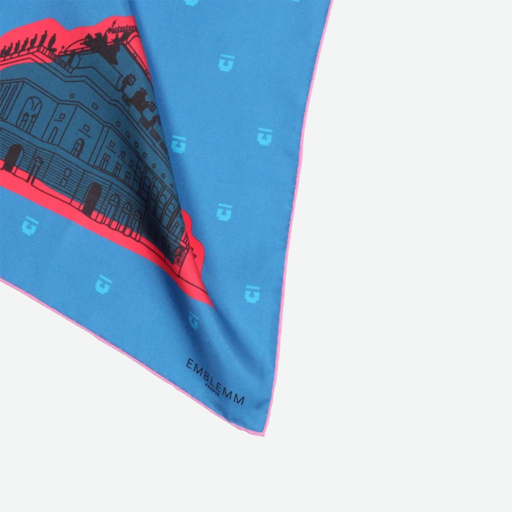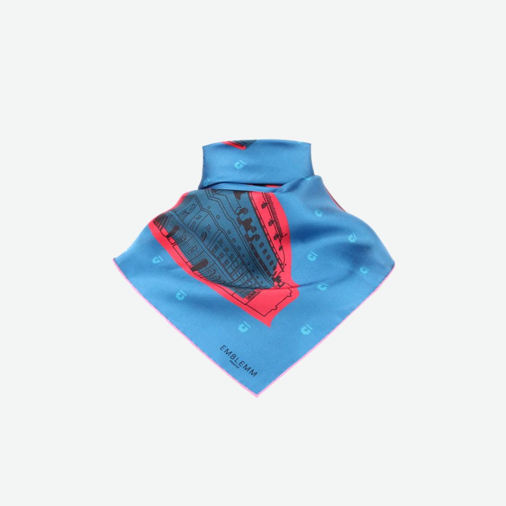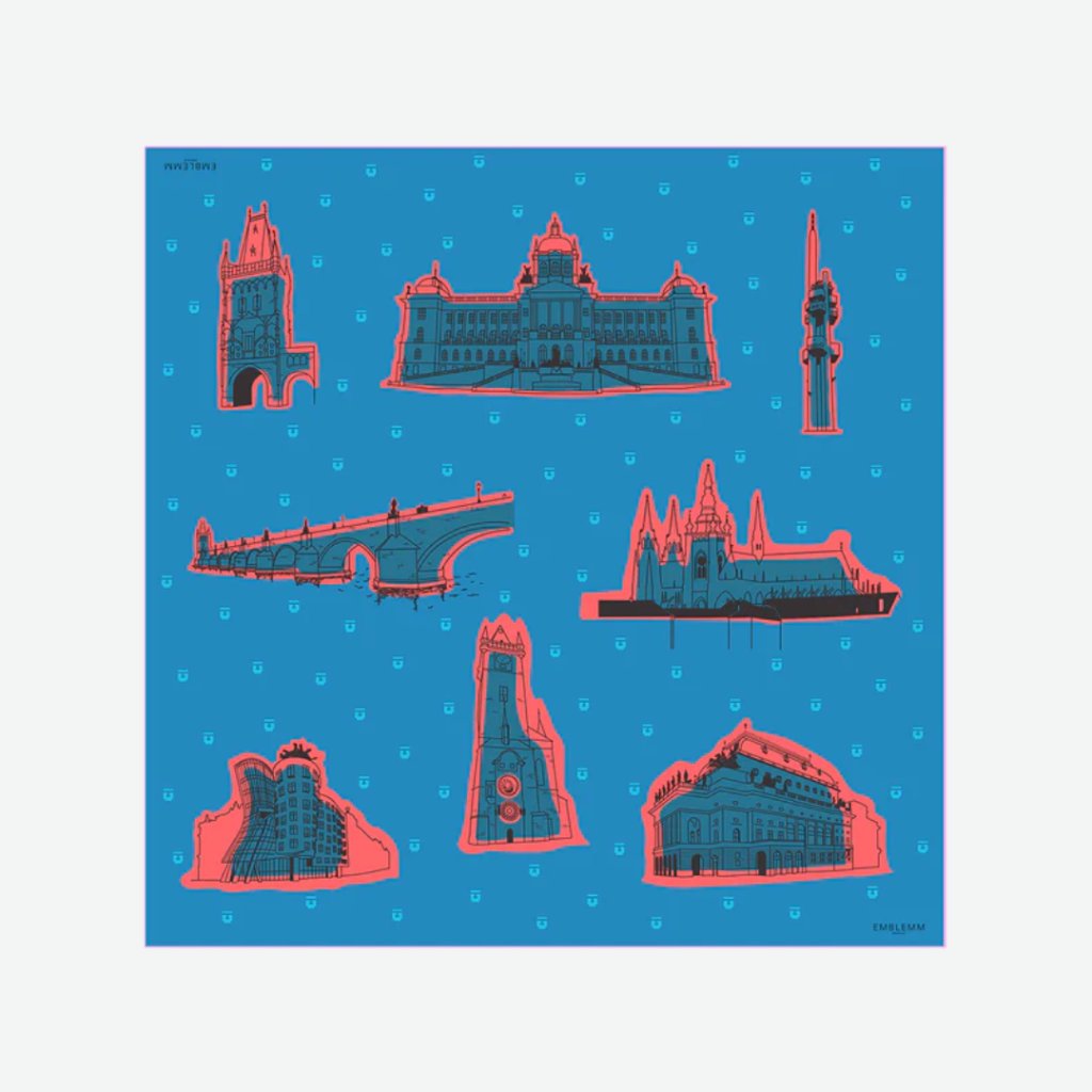 Krásný modro červený čtvercový šátek s pražskými motivy se stane tím doplňkem, po kterém budete chtít sáhnout každý den. Navrženo čistě z vlastenectví a lásky k Praze – první produkt značky byl poprvé uveden v roce 2015 a zobrazuje ikonické pražské stavby, jako jsou Pražský hrad, Národní divadlo, Karlův most, Staroměstský orloj, Tančící dům, Prašná brána, Žižkovská věž a Národní muzeum. Kontrastní pozadí zdobí logo značky ve tvaru písmene „E“. Vysoce kvalitní italské hedvábí je precizně střiženo a ušito v Česku.