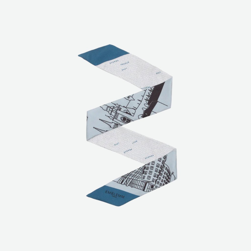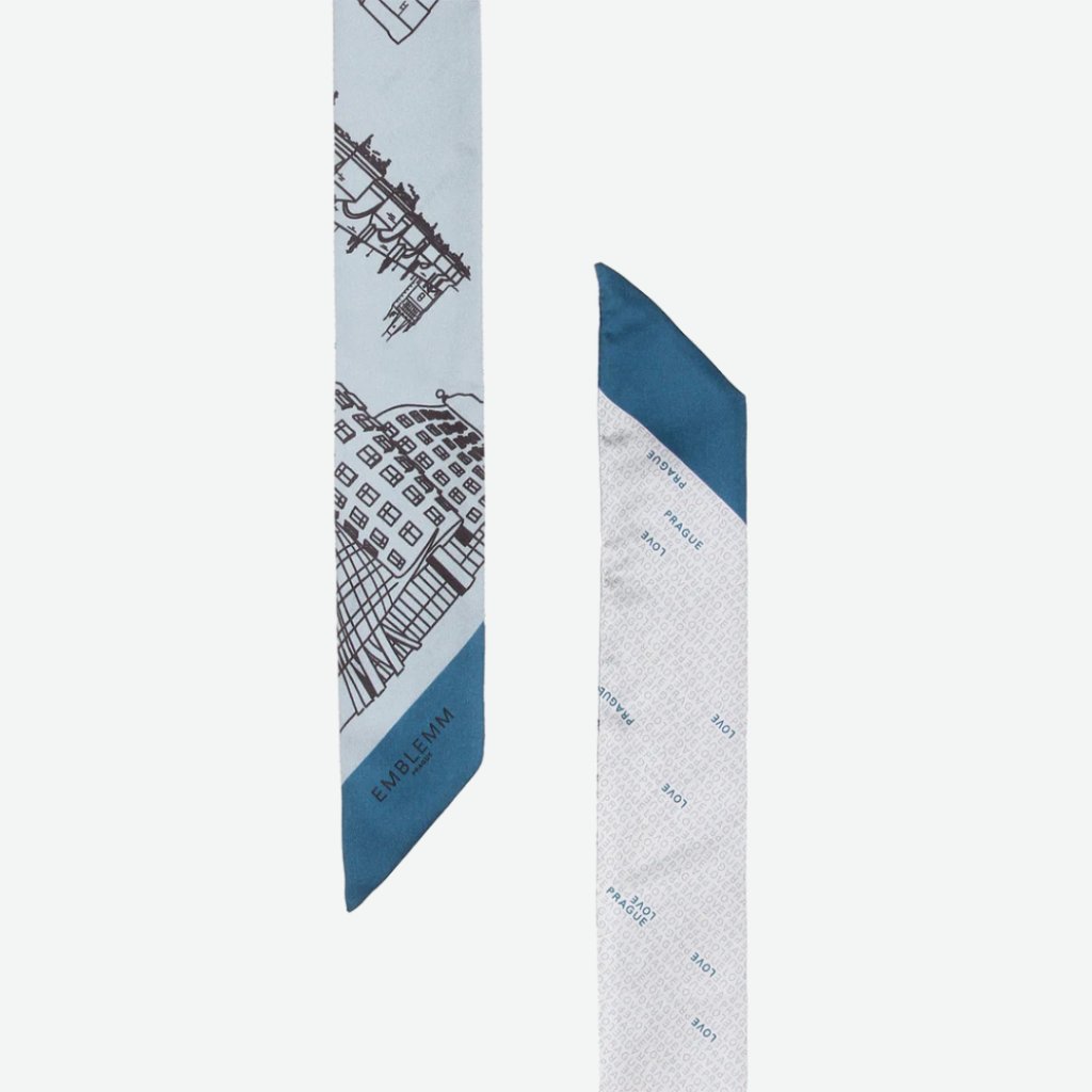 Krásný modrý úzký šátek s modrým detailem a pražskými motivy se stane tím doplňkem, který bude vyprávět příběh. Nechte se očarovat kouzlem prahy a elegantního designérského kousku. Navrženo čistě z vlastenectví a lásky k Praze – první produkt značky byl poprvé uveden v roce 2015 a zobrazuje ikonické pražské stavby, jako jsou Pražský hrad, Národní divadlo, Karlův most, Staroměstský orloj, Tančící dům, Prašná brána, Žižkovská věž a Národní muzeum. Textové pozadí tvořené slovy LOVE a PRAGUE, vyjadřující vztah designéra značky Matěje Maňáka k rodnému městu, uprostřed tvoří obrys Vltavy. Vysoce kvalitní italské hedvábí je precizně střiženo a ušito v Česku.