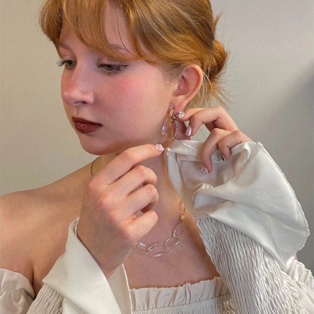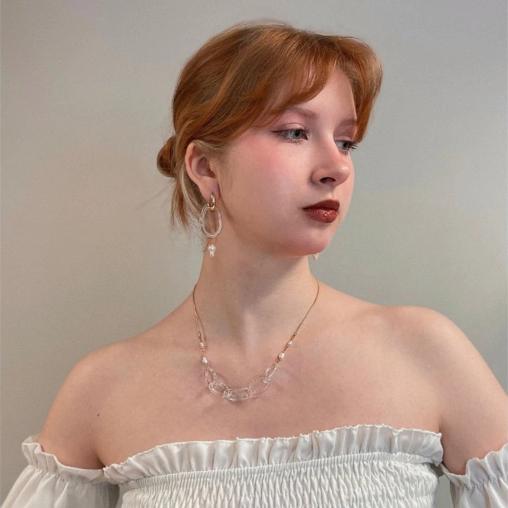 Čirý skleněný prvek vytváří hru světla a stínu, která působí minimalisticky, ale přitom výrazně. Spojení jemných materiálů s odvážným tvarem dává šperku punkový i elegantní nádech, přesně tak, aby vystihl vaši osobnost.