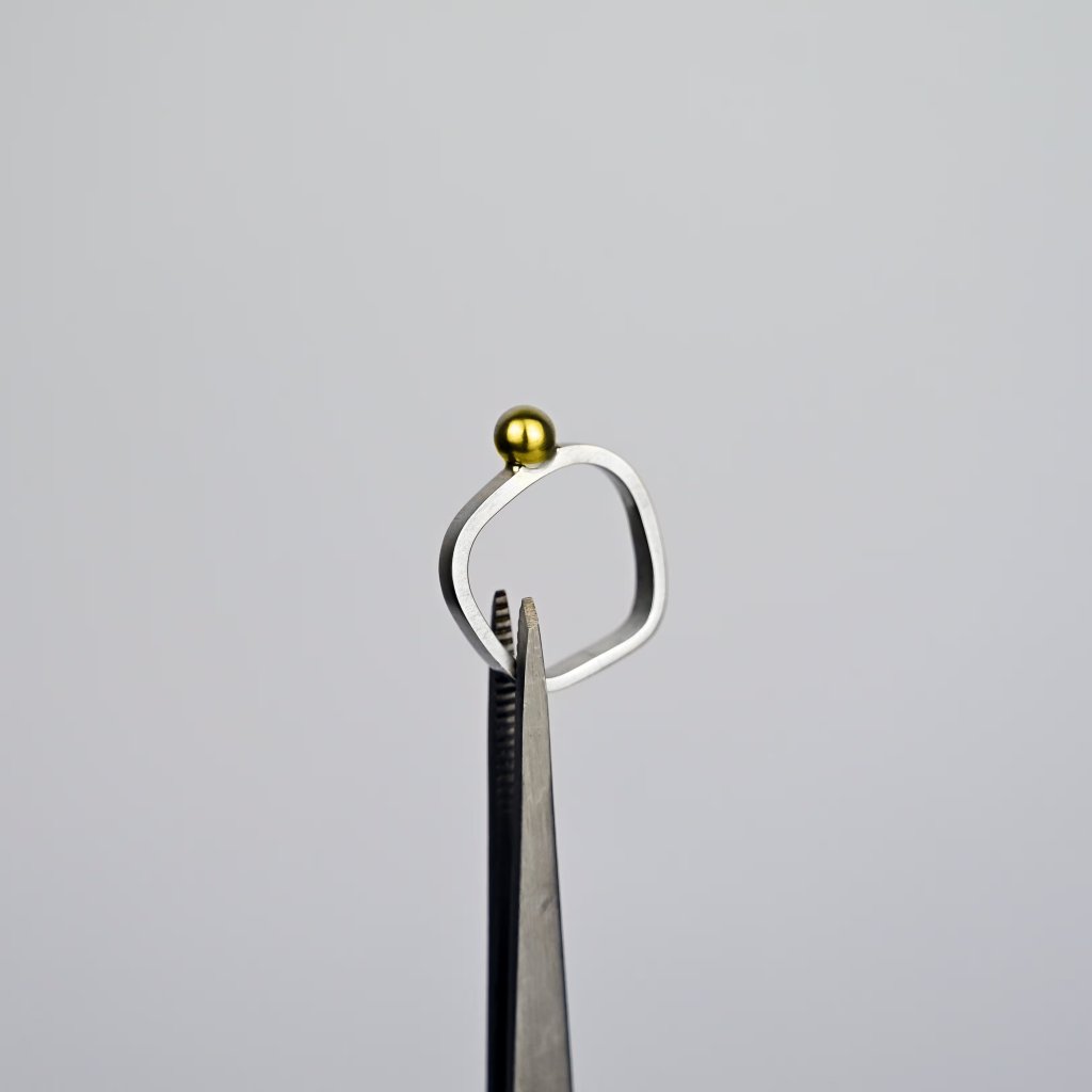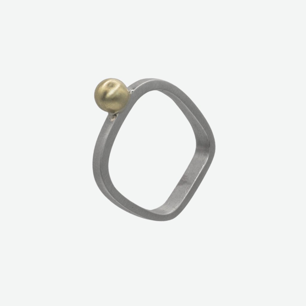 Stříbrný prsten od Anny Baum je jemným a precizně zpracovaným šperkem, který kombinuje matované stříbro s elegantní zlatou kuličkou o průměru 5 mm. Nepravidelná obroučka ve velikosti 52 není náhodná, tvar prstenu je promyšlený tak, aby byl pohodlný na nošení a zároveň vyvolával jemnou dynamiku a vizuální zajímavost. Prsten spojuje minimalistický design, precizní řemeslo a nadčasovou eleganci, a stává se tak ideálním doplňkem pro každodenní nošení i speciální příležitosti. Každý detail odráží Anninu filozofii práce s tvarem a materiálem a její schopnost kombinovat jednoduchost s promyšlenou originalitou.