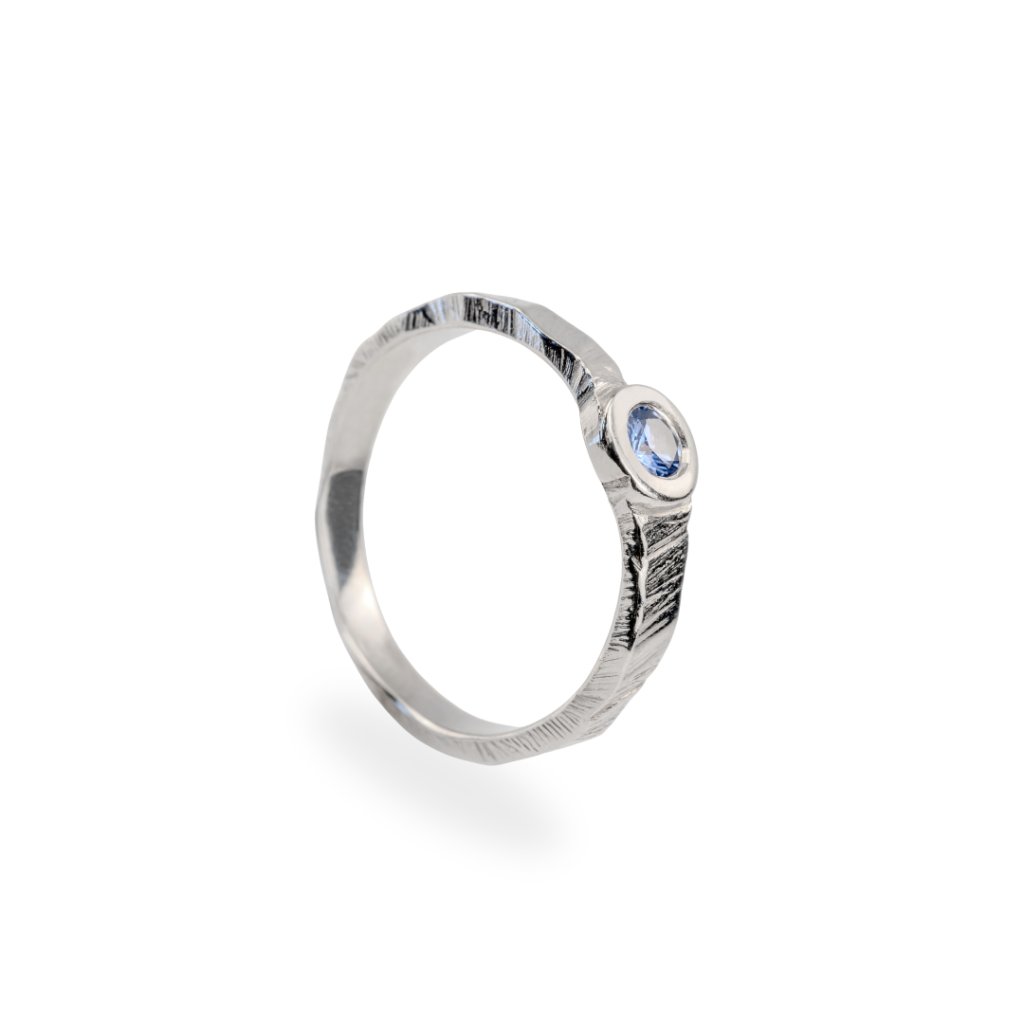 Zásnubní prsten Gaya je poctou divoké kráse Země a vody. Jeho strukturovaný povrch symbolizuje přirozené nerovnosti života – surové, autentické a krásné ve své nedokonalosti. Je vyroben z bílého zlata. Uprostřed prstenu září přírodní safír, který evokuje lesní studánku – hlubokou, tajemnou a plnou života.