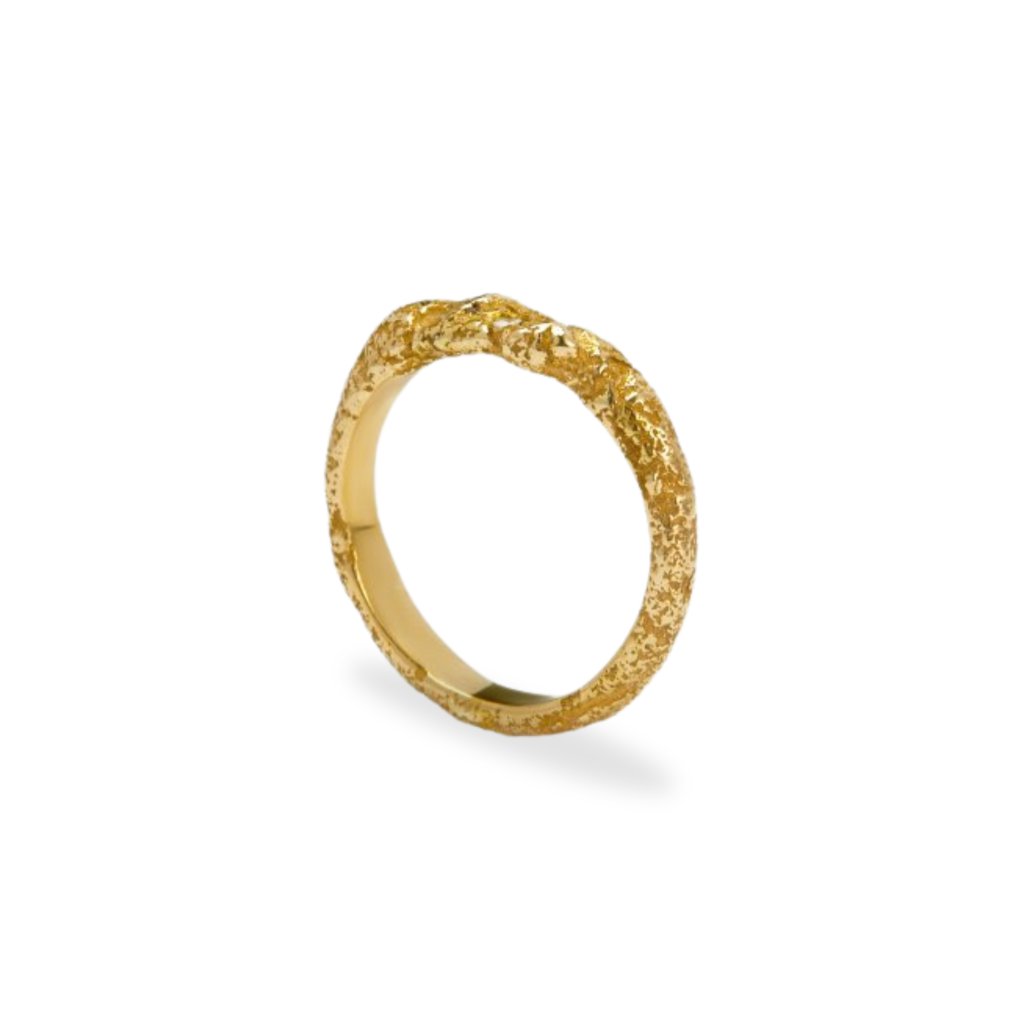 Zlatý zásnubní prsten Linus má pozoruhodný organický tvar, který je neopakovatelný a jedinečný. Je unikátním spojením příběhu, designu a symboliky. Kolekce New Archeology, vytvořená designérkou Eliškou Lhotskou, čerpá inspiraci ze světa budoucnosti, kde i obyčejný kousek chleba může být odlitek historie, uchovaný v kovu pro příští generace.