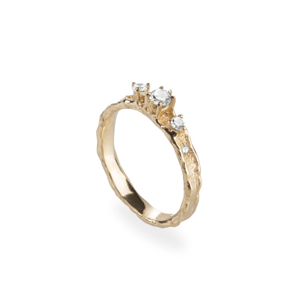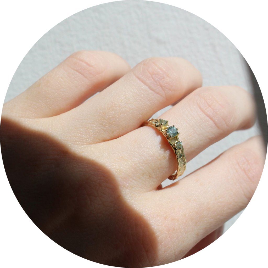 Zlatý zásnubní prsten Nitro Moss je poctou tajemství lidského nitra – prostoru, který je hluboce osobní, proměnlivý a nedělitelný. Tento ručně vyráběný prsten zhmotňuje emoce, sny, obavy i přání, které tvoří naši vnitřní krajinu. Je osázen pěti diamanty, které září svou čistotou a krásou.